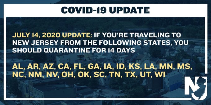 Theyre requiring travelers from states with a surge in cases to self-quarantine for 14-days when they arrive. Governor Murphy today advised individuals traveling to New Jersey from additional states with significant community spread of COVID-19 to quarantine for a 14-day period from the time of last contact within the identified state. More travelers coming to New Jersey New York and Connecticut including those from nearby Delaware are being asked to.